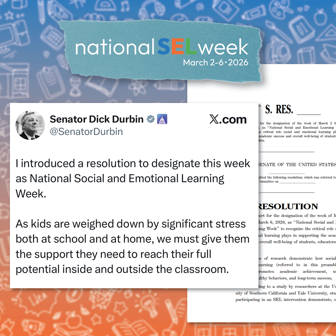 Back to topNine U.S. Senators co-sponsored a resolution introduced by Senator Dick Durbin (IL) expressing support for the designation of National Social and Emotional Learning Week. We’d like to thank Senator Durbin for his continued support of social and emotional learning. See his remarks on National SEL Week and press release for more information.