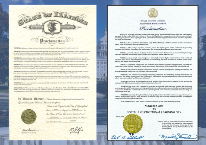 In addition, Hawaii, Illinois, New Jersey, New York, and Vermont released state proclamations or resolutions recognizing either International SEL Day as March 2, 2026, or March 2–6, 2026, as National SEL Week.