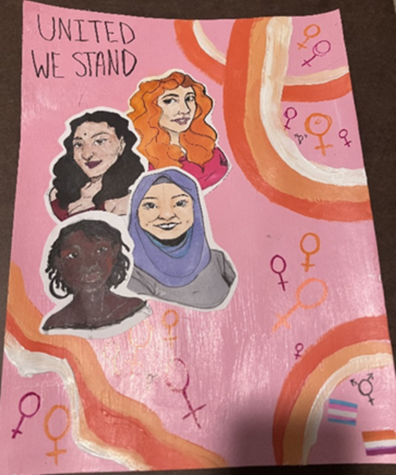 When creating protest art, the ambassadors were asked to think about an issue they care about. Artist Jess Bird of Bless the Messy helped ambassadors formulate ideas and media to use. Itahlia hopes her protest art will help others think about perspective. “By showcasing the different women, it displays how they (should) show up for each other”: