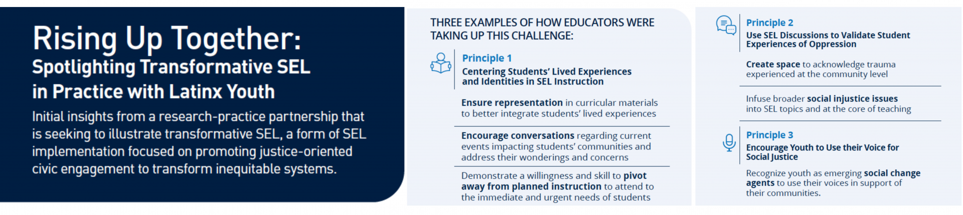 - Our 2021 research brief, Rising Up Together: Spotlighting Transformative SEL in Practice with Latinx Youth, is part of initial efforts to illustrate what Transformative SEL looks like in the classroom based on surveys with youth, interviews with teachers, and observations during dedicated SEL instruction time in a predominantly Latinx school in a large urban district.